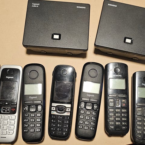 Samlade trådlösa telefoner med basstationer i olika modeller och utföranden. Inkluderar flera handset-telefoner med knappsats och display, samt äldre modeller med antenner. Användbara för röstkommunikation i hem eller kontor.