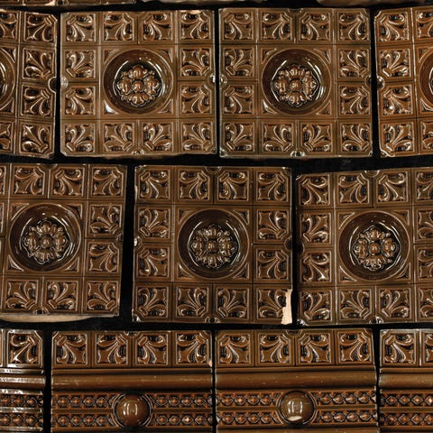 Brun rektangulär kakelugn med hylla - Fler skift finns