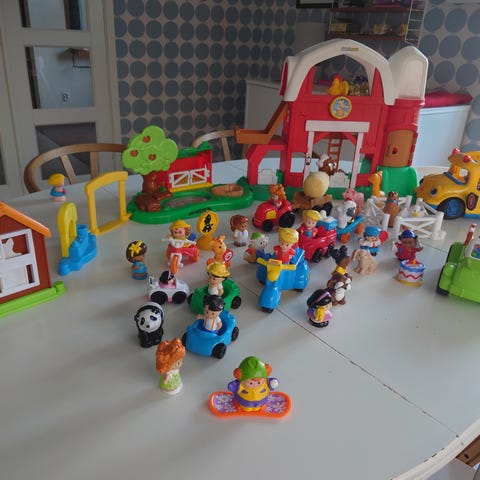 Leksak Fisher-Price bondgård leksak i plast med röd, vit och grön färg. Inkluderar flera djurfigurer och en liten mänsklig figur. Leksaken har ett handtag för enkel bärbarhet och olika sektioner som representerar en bondgårdsmiljö.