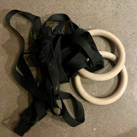 Träningsringar (gymringar/romerska ringar) tillverkade i trä med justerbara svarta remmar. Används för kroppsviktsövningar och gymnastik. Ringarna är av naturligt trä och remmarna är av slitstarkt material med spännen för enkel justering.