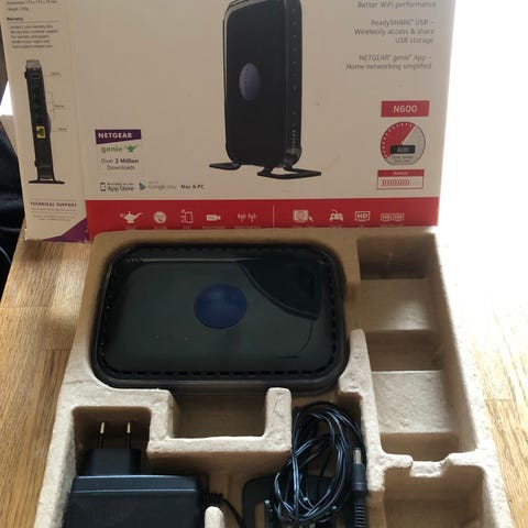 Flera fjärrkontroller och nätverksrelaterade enheter inklusive en router och laddstation. Olika storlekar och modeller av fjärrkontroller för olika användningsområden. Enheterna är i varierande färger och material.