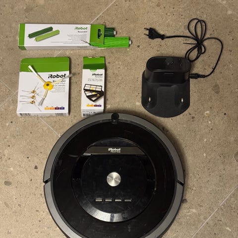 Den svarta robotdammsugaren iRobot Scooba 450 har golvrengöringsfunktioner, inklusive en våtmoppborste. En handhållen laddningsstation ingår.