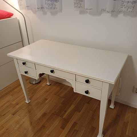 Skrivbord med mycket karaktär och historia. Bordet är slipat för att ta fram det vackra, gamla träet och har använts under många år som en kreativ arbetsplats. Stabilt och i gott skick, med en känsla av nyrenässans. Ett av hängen till låsen saknas, men det går bra att öppna ändå, för den som är pysslig är det lätt att ersätta med något annat. Nu redo att hitta ett nytt hem. Hämtas i Julita.
