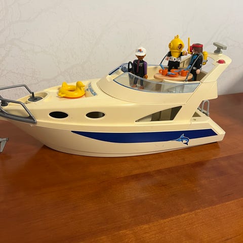 det var en gång ett stort priatskepp med master men vår son var mer intresserad av att lasta på bilar, figurer, slänga ankare och dra båten på hjulen den har. så masterna rök snabbbt. Den är ganska stor så gillar man båtar kommer man ha mycket nytta av denna. Det är annars ganska svårt att hitta stora leksaksbåtar.