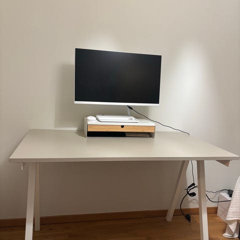 Trotten skrivbord 120 x 70 cm, använt sparsamt i ca 1 år, mestadels stått på kontoret orört. Beige med vita ben. Inköpt för 1700 kr 2024. Säljes för 900 kr.