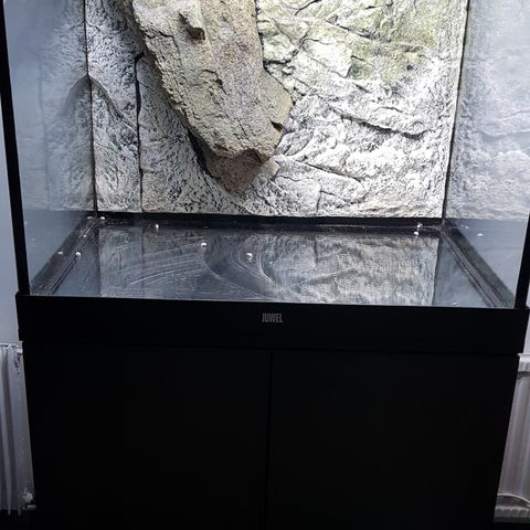 Juwel akvarium på 180 liter med tillhörande skåp. Akvariet är 101 cm långt och har en bakgrund med stenmotiv. Skåpet är svart och designat för att passa akvariet.