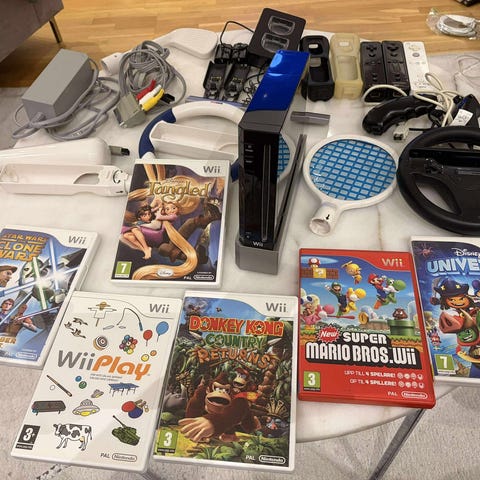 Nintendo Wii konsol med tillbehör och spel. Jag och min syster fick ett Wii i julklapp för måååånga år sedan och blev så ledsna när den gick sönder (slutade läsa CD-skiva). Så för cirka 5 år sedan kompletterade vi via Blocket, har därför dubbletter/tripletter av vissa saker. I år spenderas julen med resning hemma hos föräldrarna så nu är det med sorg i hjärtat vi gör oss av med allt.