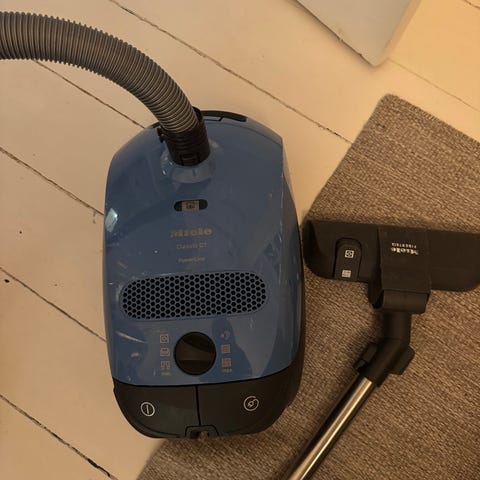 dammsugare i röd färg med sladd och munstycke. Lämplig för allmän rengöring av golv och mattor.