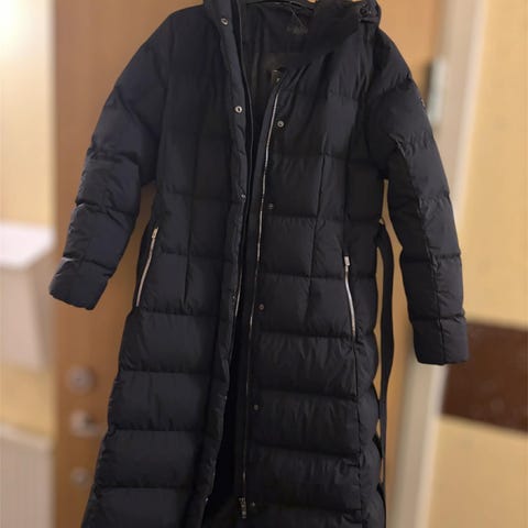 Vit jacka med huva och dragkedja framtill. Jackan har fickor med dragkedja på sidorna.