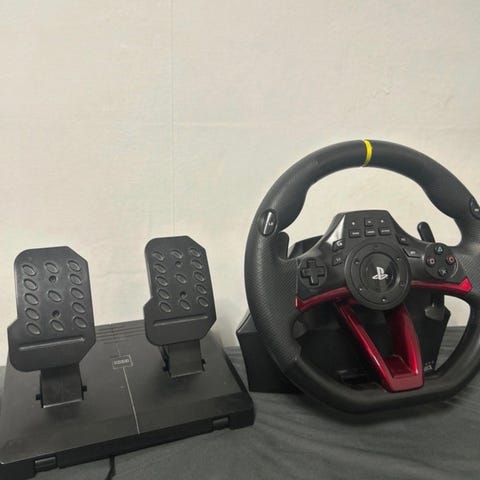 Hori ratt med pedaler för playstation. Svart färg med ratt i läderliknande material och pedaler i metall och plast. Utrustad med flera knappar och rattpaddlar för spelkontroll. Ansluts med kablar för ström och dataöverföring.