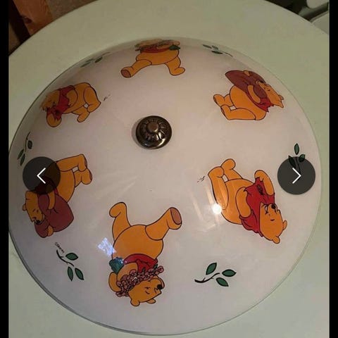 Barntaklampa (plafond) med björnmotiv. Lampskärmen är av glas och ca 38 cm i diameter.