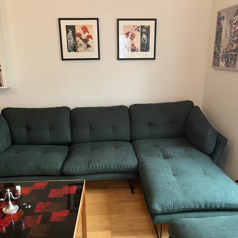 En divansoffa i nyskick. Finaste fullannillinskinn i färgen mörkgrön. Inköpt för 47000 kr på Folkhemmet i Arninge för 1,5 år sedan. Kvitto finns