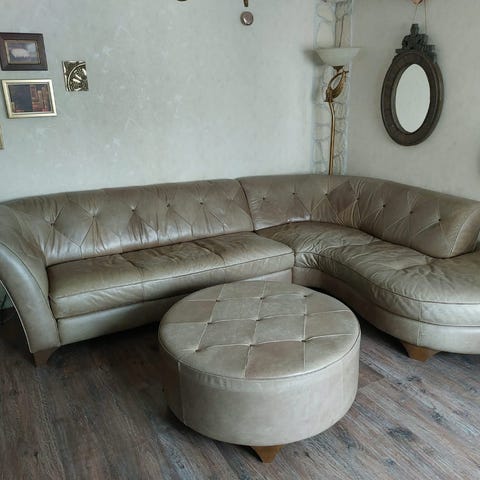 En divansoffa i nyskick. Finaste fullannillinskinn i färgen mörkgrön. Inköpt för 47000 kr på Folkhemmet i Arninge för 1,5 år sedan. Kvitto finns. Ett klipp!