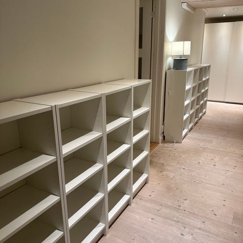 Två vita Billy bokhyllor, 237 cm höga. Ramarna är ihoplimmade och stabila.