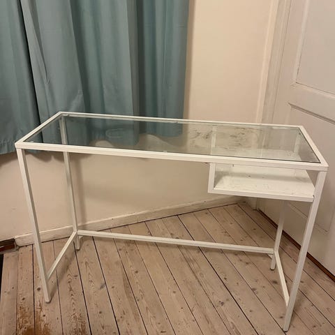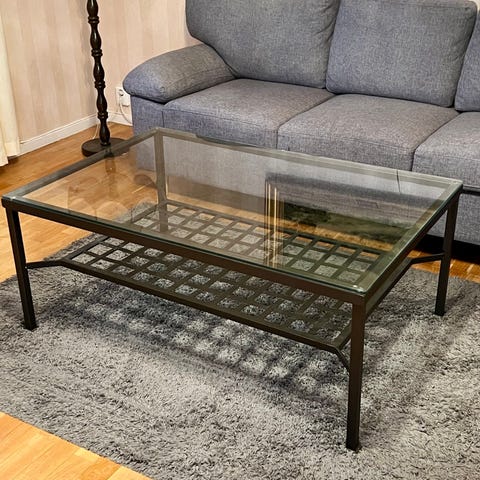 IKEA-soffbord med glasbordsskiva och ram i trä. Bordet har en kvadratisk form med transparent glas och naturlig träfärg på ramen.