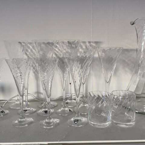 En samling glas. 14st champagneglas, 8st rödvinsglas, 6st portvin/snapsglas. Dricksglas/tumblers 5st lite större 7st lite mindre. Alla med etiketten kvar. Totalt 40st Nypris 150-250:- st. säljer helst alla i grupp. Annars blir styckpriset högre.