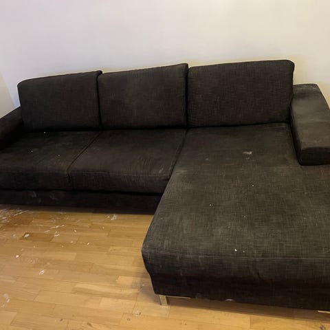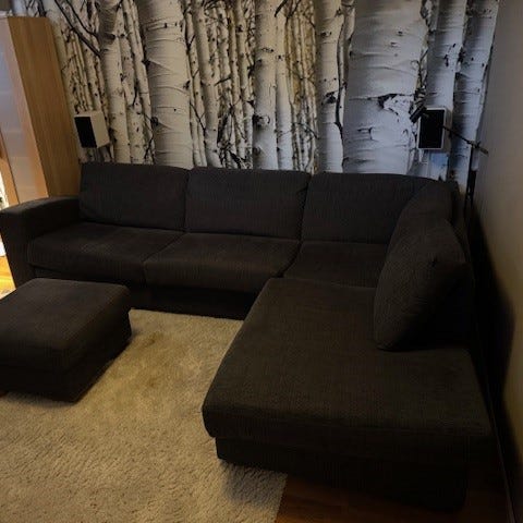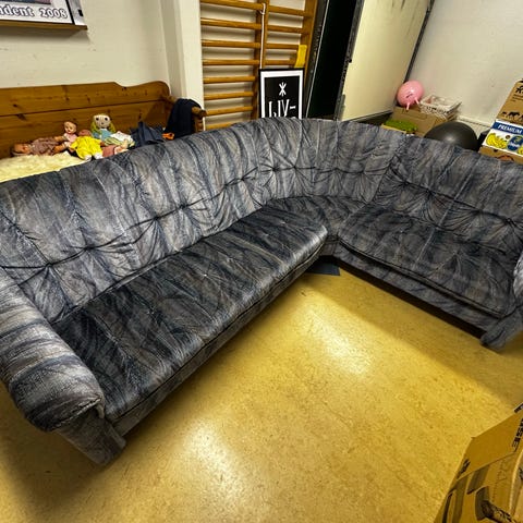 Vi skänker vår soffa i mörkblå plysch. Okej skick men något nedsutten och kudden på schäslongen har blivit förstörd av en fårskinnsfäll (se bild). Det finns även en stearinfläck på baksidan av schäslongen.