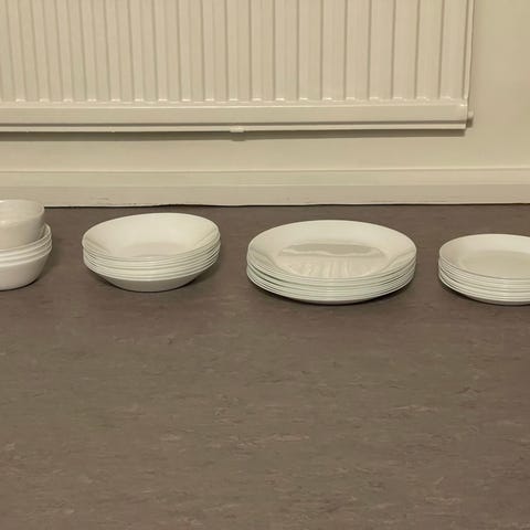 IKEA tallrikar och skålar i vitt porslin. Setet innehåller 11 stora djupa (22 cm) och 11 stora platta (27cm) tallrikar samt 8 skålar (16,5cm) i enhetlig vit färg.