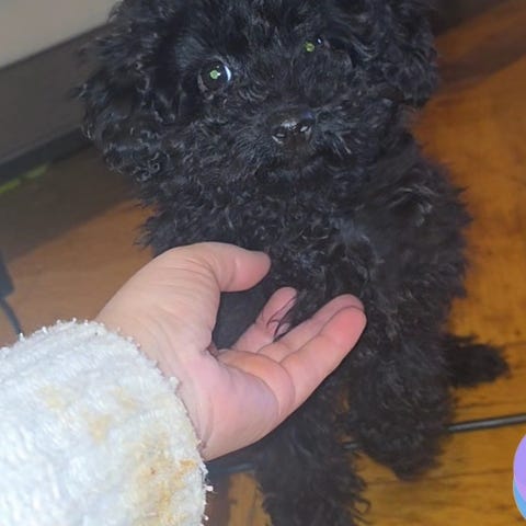 Han är en fantastisk blandras av dvärgpudel, tysk spets och tax. Fäller ej.