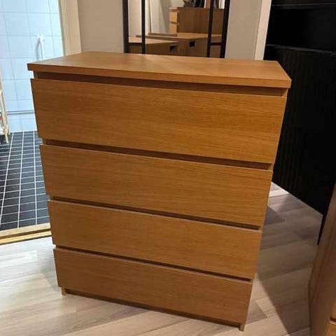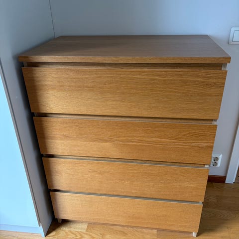 Byrå i trä med fyra lådor. Möbeln har en naturlig träfärg och en enkel design. Lådorna är rymliga och lätta att öppna. Passar för förvaring i sovrum eller andra rum.