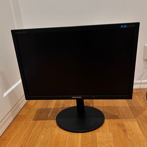 Samsung S24E650PL bildskärm med 24 tum skärmstorlek. Utrustad med HDMI, VGA och DisplayPort anslutningar. Skärmen har justerbar höjd och kan användas i både liggande och stående läge.