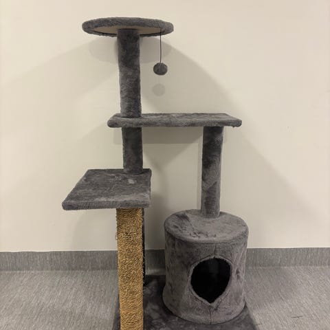 Kattklätterställning med flera nivåer, plattformar och hängmattor i grå. Tillverkad för att ge katter möjlighet till klättring, lek och vila.