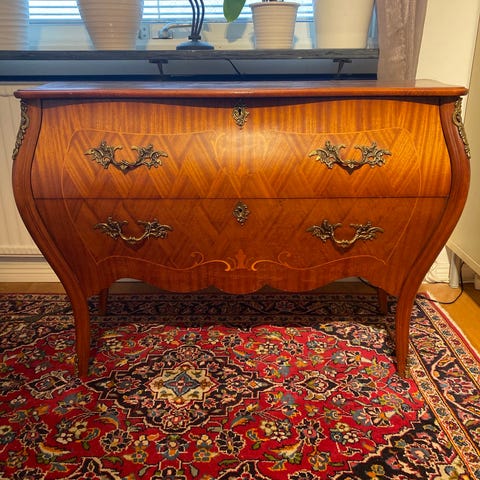 Ett vackert gammalt skåp med spegel och många fack. Dessutom mycket praktisk då den rymmer mycket. Nycklar finns. Enda felet är att den stora luckan på framsidan inte går att låsa. Skåpet är 145 cm högt, 100 cm brett och drygt 40 cm djupt. En gammal släktklenod som vi tyvärr inte får plats med pga ombyggnad av huset. Snickarna har aviserat att de kommer redan den 12 så det blev bråttom. Vi säljer därför skåpet för 500 men hämtar köparen det före den 12/1 så kostar det bara 300 kr. Vi bor i Sjövik i Lerums kommun. Vid frågor ring Ove 0708-531325 eller Lena 0706-78 79 79