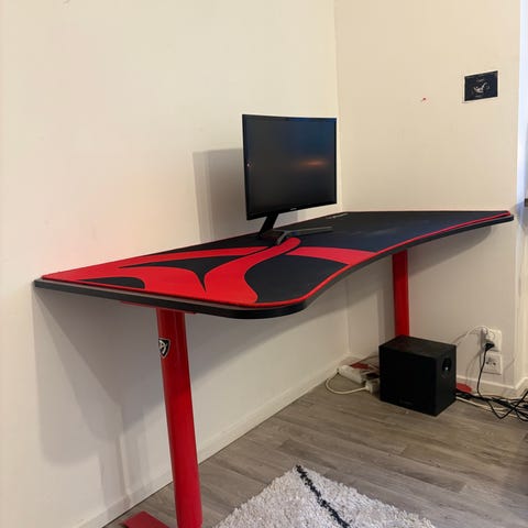 Säljer ett stabilt gamingbord av modellen Arozzi Arena. Detta är ett datorbord specifikt utformat för gaming och streaming, med en väl tilltagen yta (160 cm) som utan problem rymmer tre skärmar.