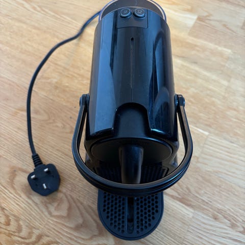 Nespresso Pixie kaffemaskin i vit färg. Kompakt design med metall- och plastdetaljer. Anpassad för att användas med Nespresso-kapslar. Lämplig för hemmabruk eller kontor.