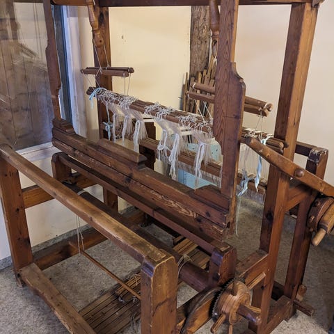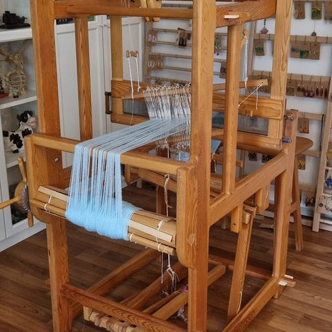 Trä vävstol med tillhörande pall. Passar för handvävning och hantverksprojekt. Robust konstruktion i trä, lämplig för olika typer av vävning.