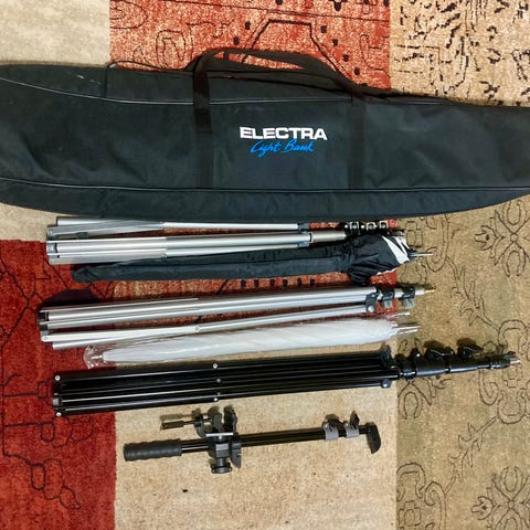 Fotostudio belysningskit med två softboxar monterade på justerbara stativ. Inkluderar bärväskor för enkel transport och förvaring. Används för jämn och mjuk belysning vid fotografering.