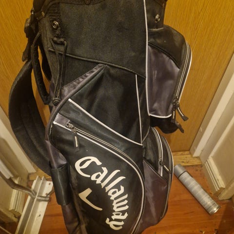 Callaway golfbag i blå färg med flera fack och bärremmar. Bagen är i fint skick och sparsamt använd, lite synbart slitage på ryggdelen (se bild).