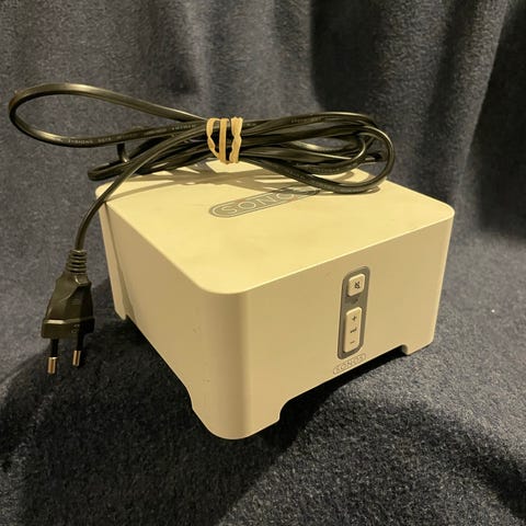 Sonos Connect ljudenhet för trådlös streaming. Enheten är vit och har flera anslutningsmöjligheter för ljudsystem.