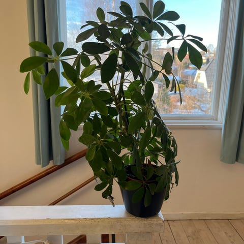 Schefflera växt med gröna blad, lämplig för inomhusbruk. Växten är placerad i en vit kruka och har en naturlig, frodig form.