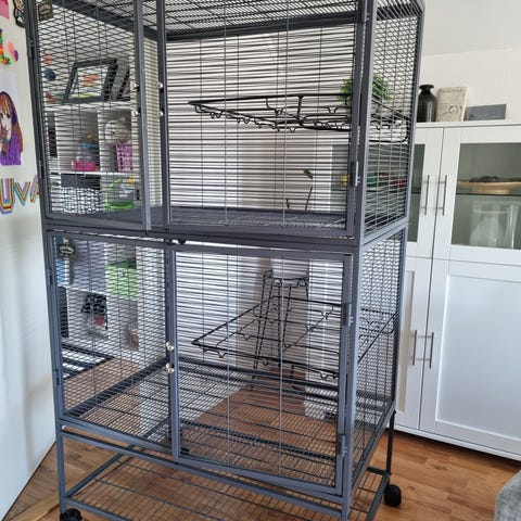 Bur med metallgaller och blå plastbotten. Buren är lämplig för små djur och har en stabil konstruktion med ett galler som ger god ventilation. Det är utan tillbehör.