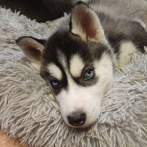 Hon är en intelligent Alskan husky som är sex månader gammal. Hon har ett blått öga med två bruna prickar i och ett brunt öga som har blått i sig, så riktigt ovanligt men vackert. Hon har levt med både katter, kaniner och hundar. Det har fungerat jättebra. Hon är inte det minsta dominant utan visar sig undergiven när hon möter nya hundar. Hon är lekfull och älskar att springa efter pinnar eller andra leksaker. Hon är väldigt kärleksfull och gillar att vara nära och gosa, sover alltid bredvid en i sängen och blir överlycklig när man vaknar. Hon ligger gärna bredvid dig i soffan framför teven. Hon har lätt för att lära som huskies brukar ha. Däremot är hon inte högljudd som många huskies brukar vara. Hon är även rumsren och kommer på inkallning.