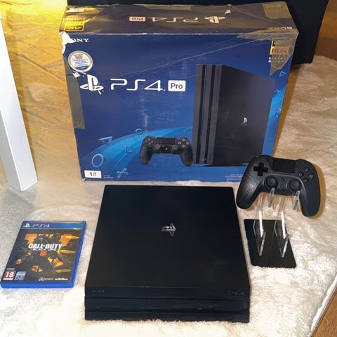 Hej, säljer min Ps4 Pro i fint skick tillsammans med kablar, två handkontroller, laddningstation för ps4 kontroll och spel.