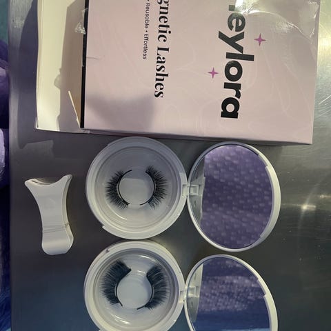Set med magnet lösögonfransar och applikatorer inklusive lim. Innehåller flera par fransar och ett lim för applicering. Designade för att fästas på ögonlocket för att förstärka ögonfransarnas utseende.