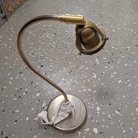 Vit bordslampa med en textilskärm som har fransar runt kanten. Lampan har en vriden fot med gulddetaljer och en sladd med strömbrytare. Passar för användning som dekorativ belysning i hemmet.