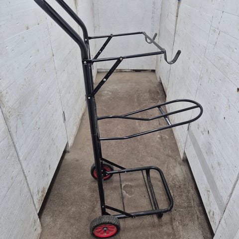Sadelvagn i metall med hjul baktill, plats för utrustning inuti vagnen. Finns i Kristianstad, betalning med Swish.
