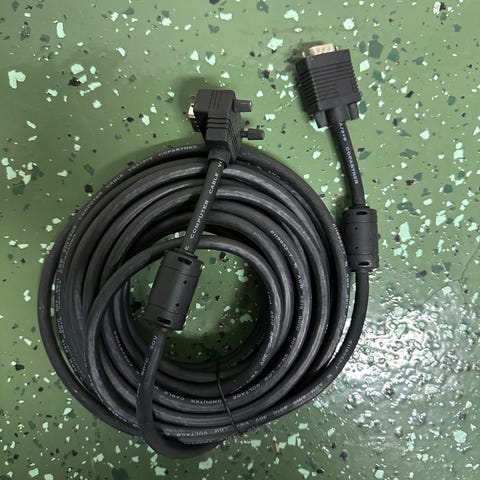 En samling av olika datorkablar och kontakter i varierande längder och typer, inklusive VGA-kablar, strömkablar och andra anslutningskablar. Kablarna är av olika färger som svart, vit och grå och är avsedda för användning med datorer och kringutrustning. Lådan ingår i köpet.