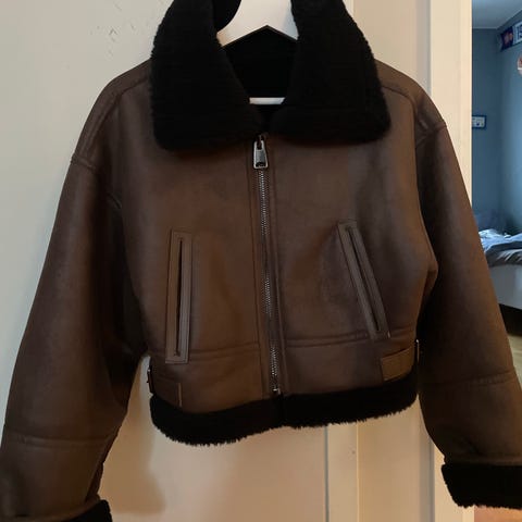 Jacka Cadi från Mango. Mörkbrun Faux leather och faux fur. Den är storlek L, men liten i storlek. Mer som en liten M. Endast provad, Nyskick! Köptes förra vintern men den har blivit för liten för mig. Har förvarats i garderoben senaste året. Inga fel alls på den.