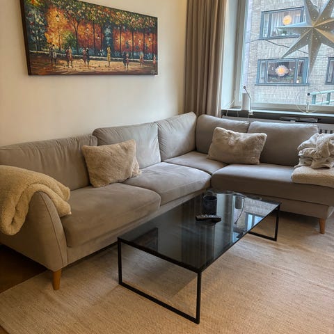 XL U soffa i beige tyg. Soffan har en modulär design med skumfyllda kuddar och träram. Passar för vardagsrum och erbjuder sittplatser för flera personer.