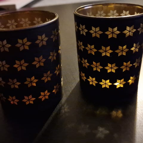 troligen Iittala Kivi-ljusstakar eller liknande glasvaror från Iittala.