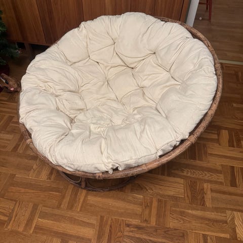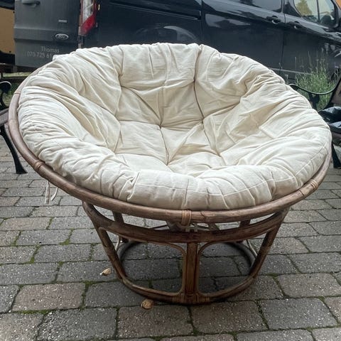 Fåtölj Rund Rotting Patinerad från Granit med naturvit dyna. 130cm i diameter