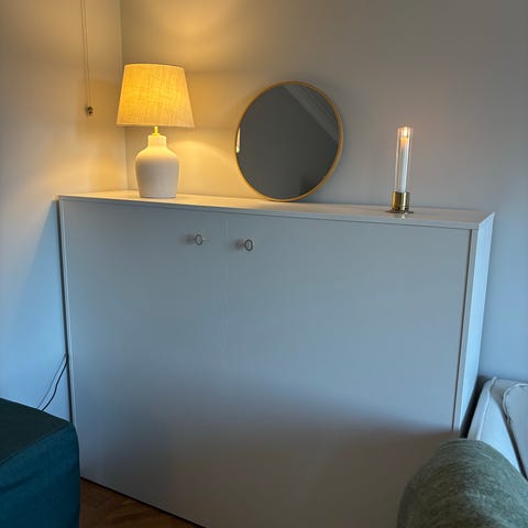 Unik produkt från ikea framtagen till Ikano bostad för att få ett extra rum. Eldriven med belysningsramp, monitordisplay och inbyggt eluttag. Passar för rum som har 250cm takhöjd. Ena delen av skåpet (väggförankras) vänster sida. andra delen förflyttas med hjul under skåpet (ej synliga). Ingen förankring eller åverkan i tak eller golv. Mått längd ca 2200mm bredd stängd 914mm och öppen 1800mm. Skåpet är i nyskick, sängen ingår och är oanvänd. Jag har bokat hantverkare som monterar ner skåpet i delar och enheter. I ditt hem får du ett rum till. Perfekt om man vill dela av en etta eller bara få en gästyta/med extra förvaring. Det går bra att komma och titta.