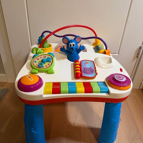 Bordet har en rund design med olika färgglada element som stimulerar barnets sinnen och motorik. Passar för små barn och har en stabil konstruktion med ben och en mjuk sittplats i mitten.