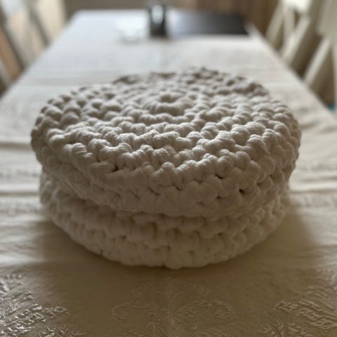 Oanvänd sittpuff i naturmaterial. Cirka 45 cm i diameter och 10 cm hög. Hämtas på Telefonplan i Stockholm.