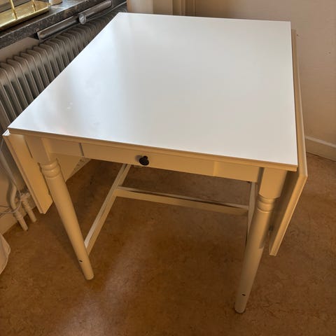 Ett praktiskt matbord med plats för förvaring. Bordet har sex lådor och utfällbara skivor. Två stolar ingår.