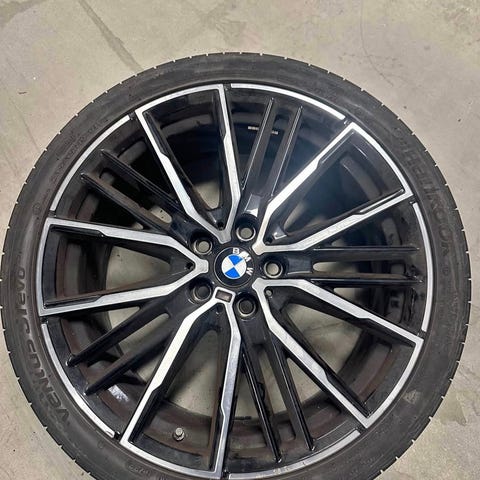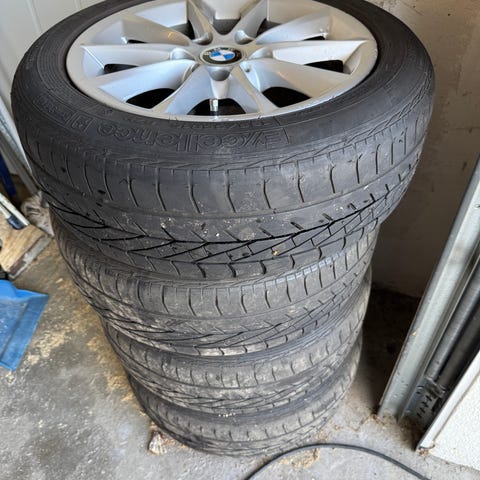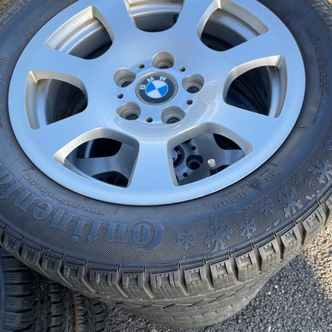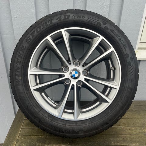 BMW Däck med fälgar. Inkluderar både aluminiumfälgar och stålfälgar med vinterdäck. Däckens skick varierar, vissa fälgar visar tecken på rost och slitage. Passar för vinterbruk och är anpassade för BMW-fordon.